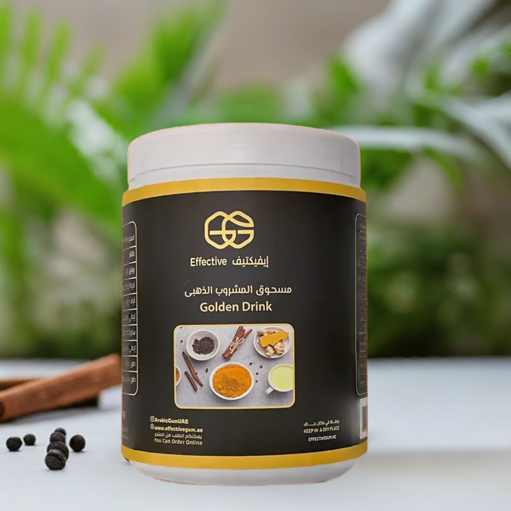 الكركم العضوي: مستخلص من جذور الكركم (Curcuma longa)، ويمنح المشروب لونه الذهبي المميز.